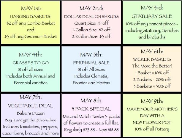 | Our Spring Open House will last more than one weekend! We will feature a different "Super Special" each day beginning Saturday, May 1st through Sunday, May 9th. Pick a day and come to enjoy the bargain that suits you best!. |