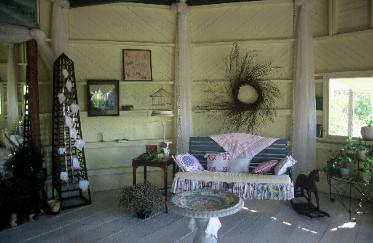 | A Garden Folly serves as a nostalgic retreat for visitors who would enjoy a rest stop in the flower garden. Here they will find comfort on the porch swing and quilt-laden lawn furniture. |